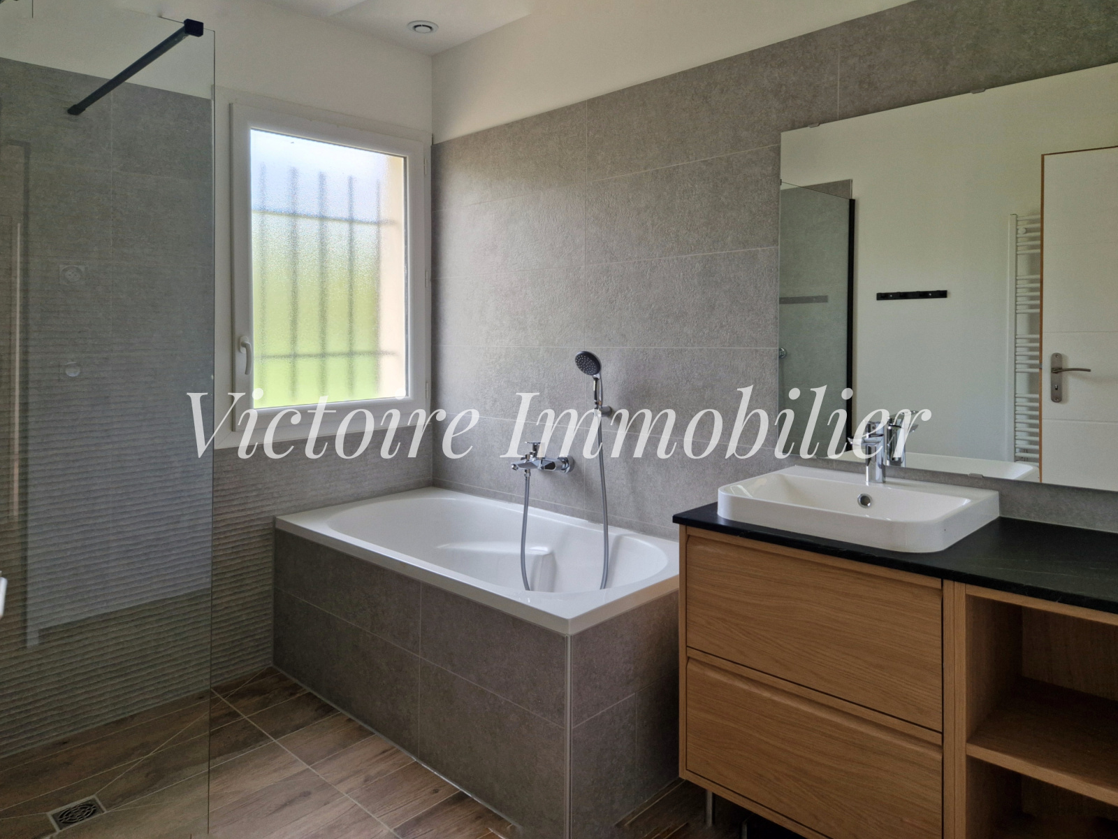 Le confort est assuré par des prestations haut de gamme : pompe à chaleur avec programmateur pièce par pièce, chauffe-eau thermodynamique, climatisation réversible dans chaque pièce. À l’extérieur, une terrasse en bois permet de profiter d’un cadre agréable et calme.