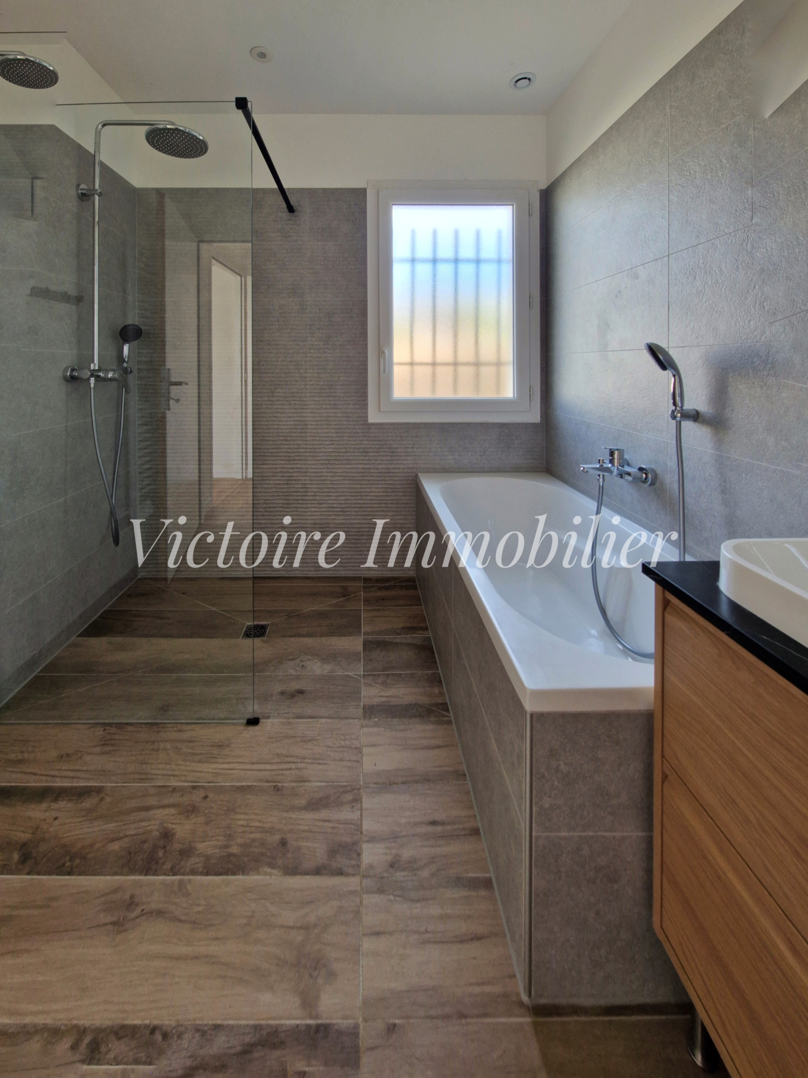 La maison bénéficie de prestations modernes : climatisation réversible dans chaque pièce, pompe à chaleur avec programmateur indépendant, chauffe-eau thermodynamique. À l’extérieur, une terrasse en bois prolonge l’espace de vie.